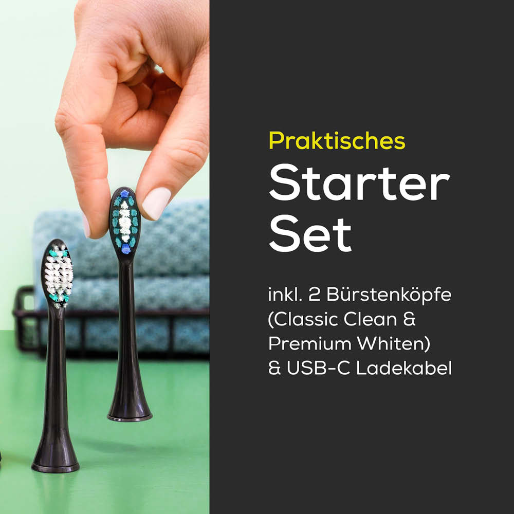 - Im Lieferumfang enthalten: 2 Aufsteckbürsten (Classic Clean und Premium White), Ladestation mit USB-C Anschluss mit kurzer Ladezeit