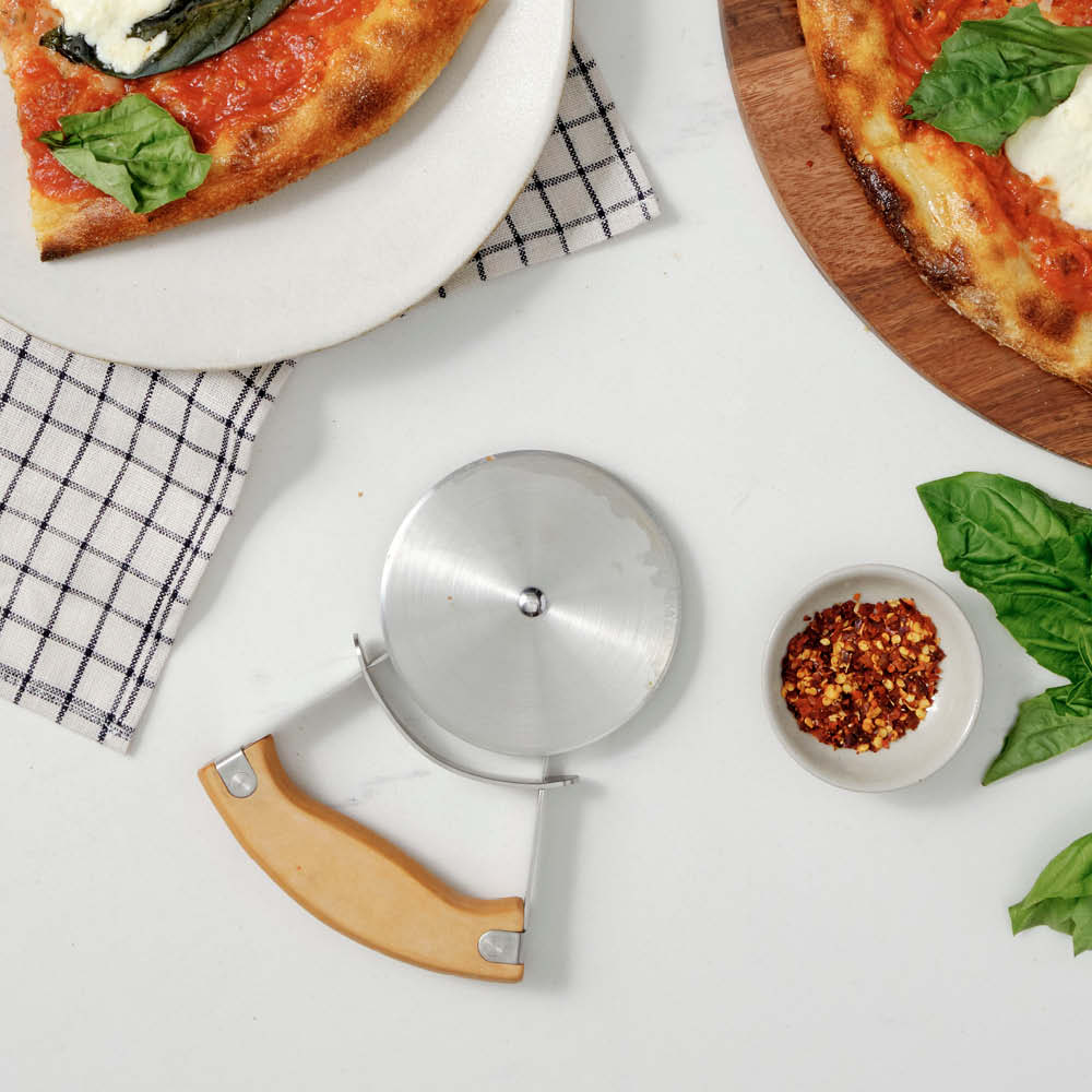 Der Ooni Pizzaschneider besitzt eine extrem scharfe Klinge aus rostfreiem Edelstahl. Mit einer zügigen Bewegung schneiden Sie mit diesem praktischen Küchenhelfer die Pizza oder den Flammkuchen in perfekte Stücke.