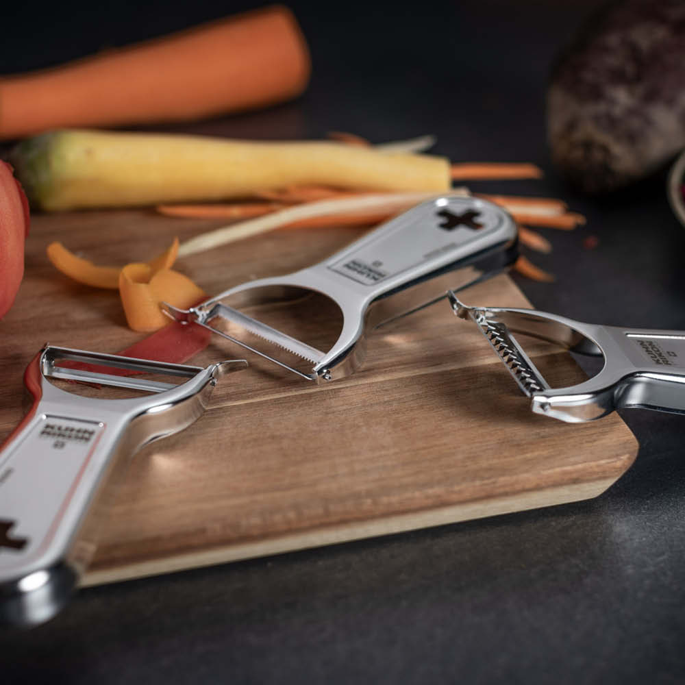 - Piranha-Messer für besonders dünne und gleichmäßige Schälresultate