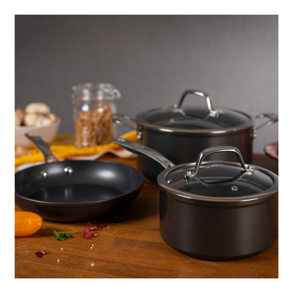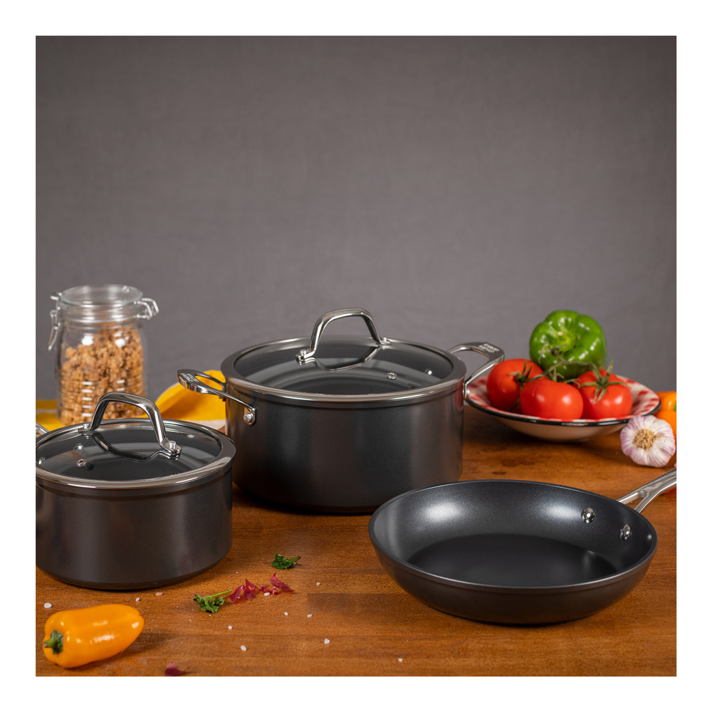 • 3-lagige Antihaftbeschichtung mit Titanpartikeln: langlebig, verschließfest und perfekt für fettreduziertes Kochen.