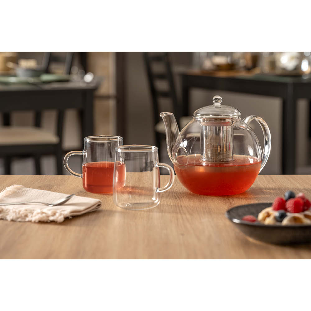 - 3-teiliges Teeset bestehend aus: gläserne Teekanne mit integriertem Teesieb, zwei gläserne Teebecher mit Henke